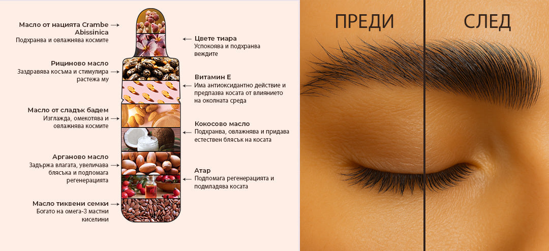 Ленено масло - източник на омега-3 киселини (т.нар. витамин F). Космите на веждите се дължат на дълбока регенерация и укрепване - омега-3 киселините допълват липидите в структурата на косъма и имат успокояващ ефект върху кожата.