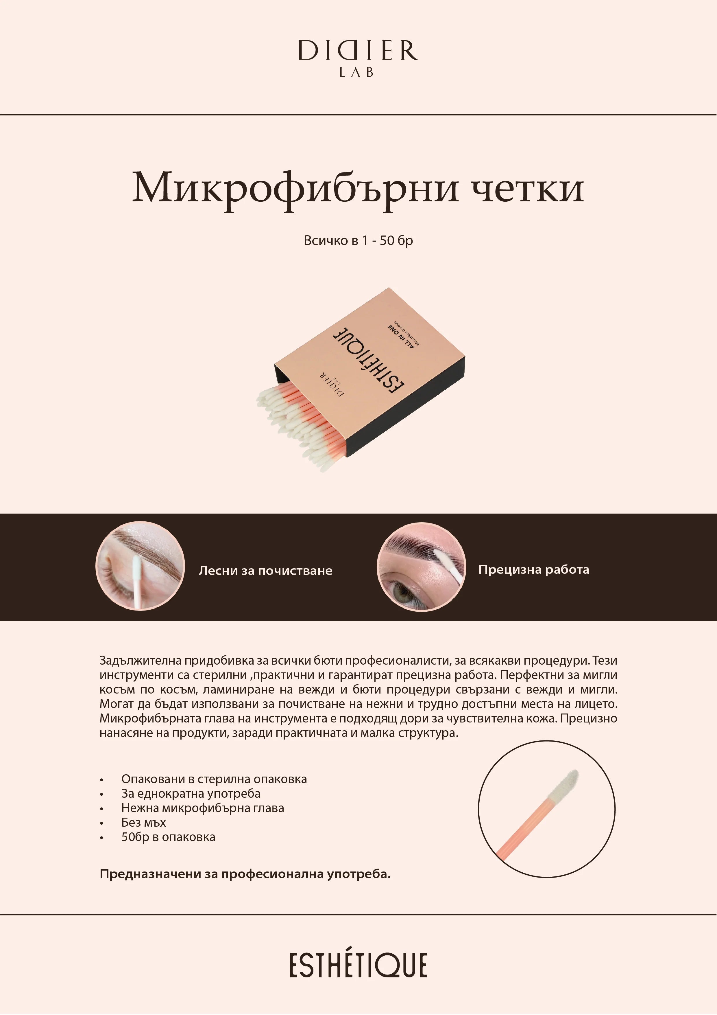 Микро-апликаторите се състоят от остро оформени влакна, които не абсорбират и не се разнищват. Малката глава на апликатора и острият връх, спомагат прецизната работа, при нанасяне на малки количества от течностите ни за ламиниране и оформяне на вежди. Малкият апликатор също премахва грешно наредените косъмчета, така че да не разрошва или размества останалите.