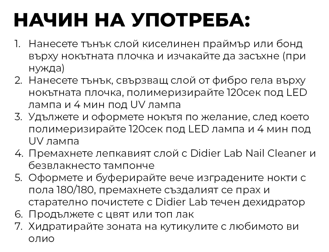 Fiber gel Didier Lab е еднофазен продукт, който съчетава всички качества на идеален гел за начинаещи и техници с богат трудов опит. Това е най-устойчивият самонивелиращ се гел, създаван някога.