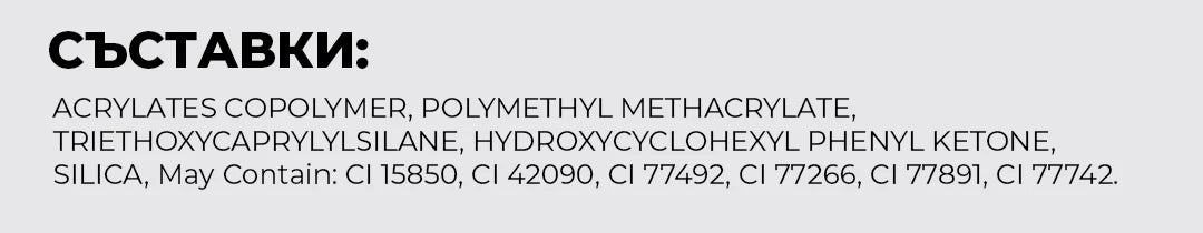 СЪСТАВ: АКРИЛАТИ КОПОЛИМЕР, ПОЛИМЕТИЛ МЕТАКРИЛАТ, ТРИЕТОКСИКАПРИЛИЛСИЛАН, ХИДРОКСИЦИКЛОХЕКСИЛ ФЕНИЛ КЕТОН, СИЛИЦЕВ, Може да съдържа: CI 15850, CI 42090, CI 77492, CI 77266, CI 77891, CI 77742.