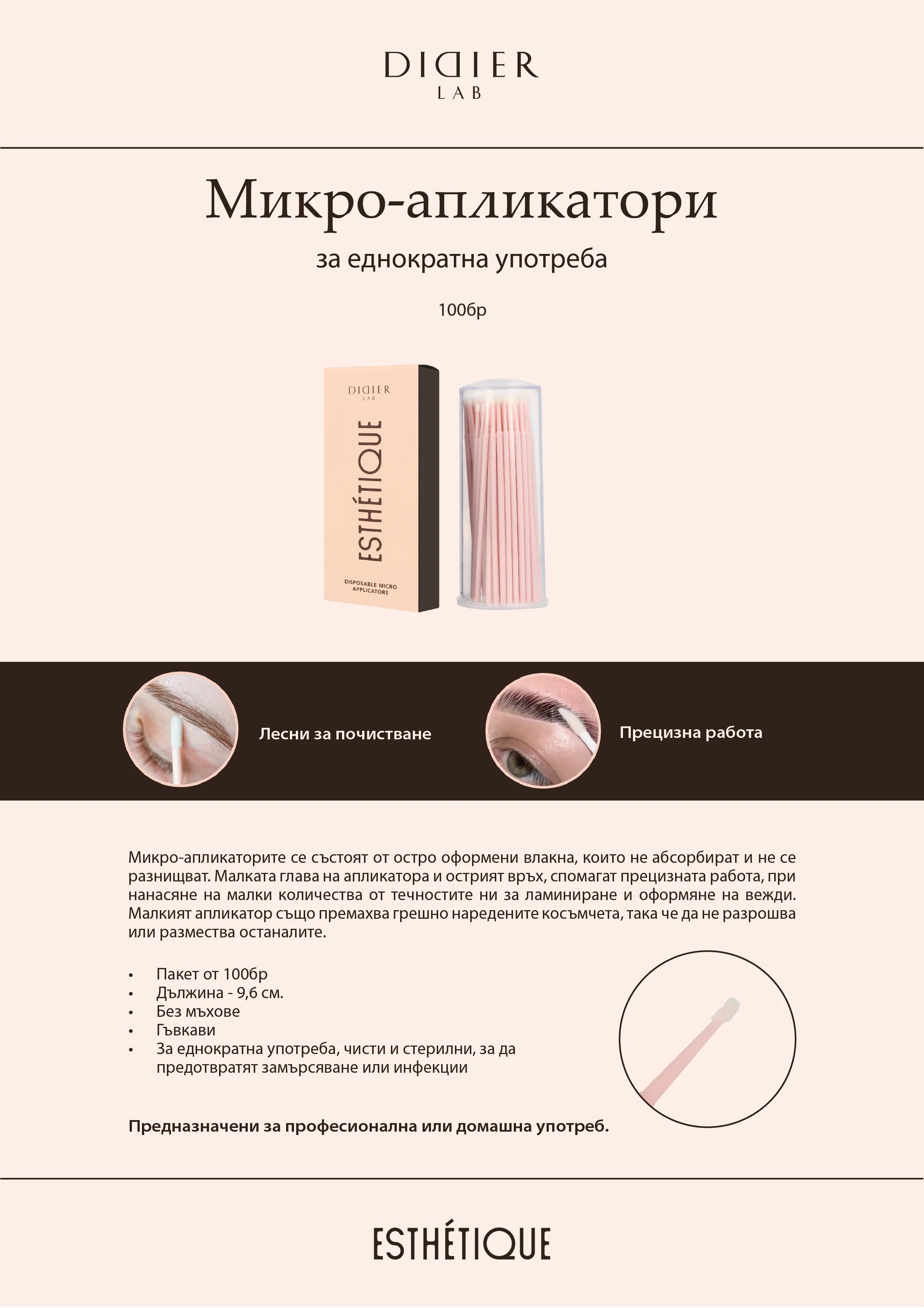 Микро-апликаторите се състоят от остро оформени влакна, които не абсорбират и не се разнищват. Малката глава на апликатора и острият връх, спомагат прецизната работа, при нанасяне на малки количества от течностите ни за ламиниране и оформяне на вежди. Малкият апликатор също премахва грешно наредените косъмчета, така че да не разрошва или размества останалите.