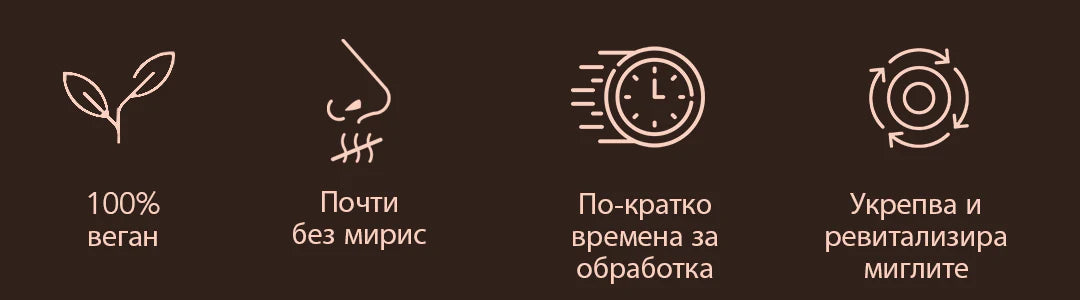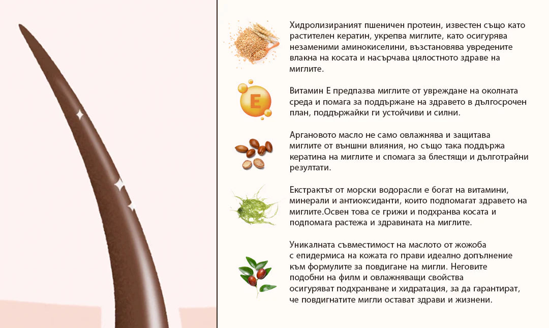 Нашите 100% веган продукти въвеждат "растителен кератин" - изключителен компонент, който използва хидролизирани пшенични протеини. Тези естествени производни на пшеничните зърна образуват уникален овлажняващ комплекс, способен да проникне дълбоко в структурите на кожата. Резултатът е перфектно балансирана хидратация и копринено блестящи мигли.