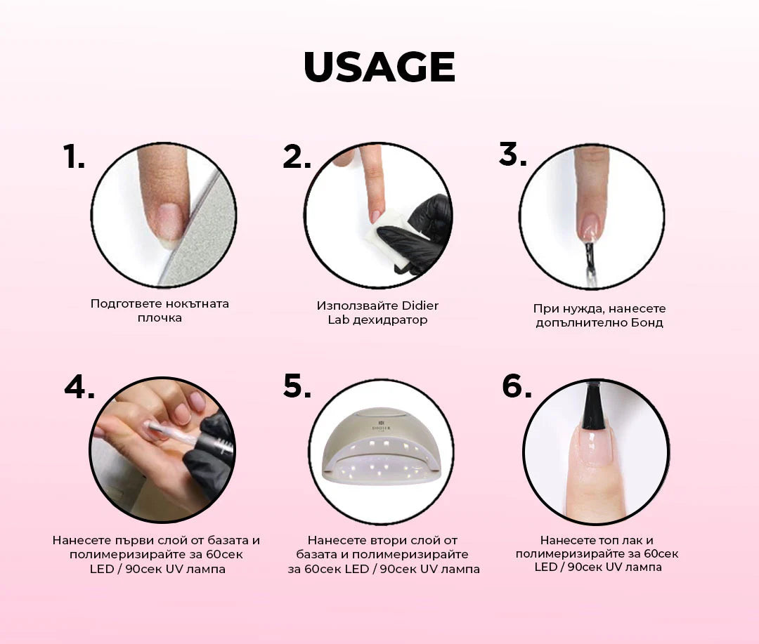 - Втвърдяване на всички слоеве: с LED лампа 60 сек / с UV лампа 90 сек