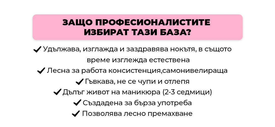 Позволява ви да работите бързо и ефективно, спестявайки изключително време! Отличен избор за френски маникюр, тъй като е предварително оцветен. Можете да го нанесете на 1 слой, за да получите приятен, полупрозрачен ефект, или ако искате по-непрозрачен вид, нанесете 2-ри слой от него. При нанасяне в по-дебели слоеве може да се постигне пълно покритие върху ноктите.
